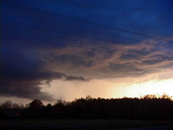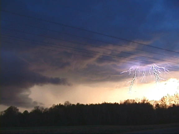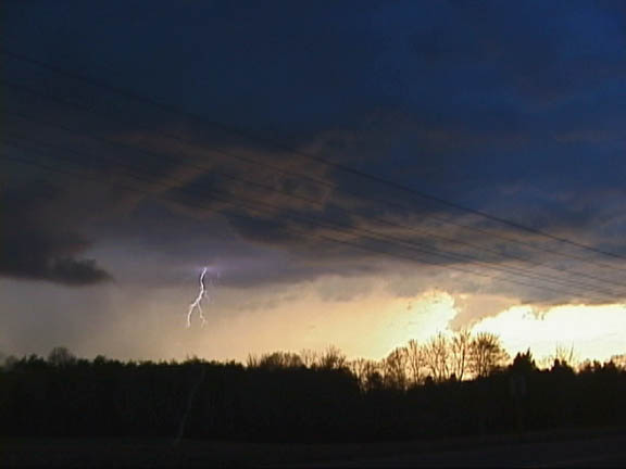 Since the best combination of moisture, heat and upper level support was predicted to be near Richmond, I decided to stay at home and monitor conditions. A band of showers passed through the city and the skies cleared allowing more daytime heating and instability. Dewpoints quickly rose to the upper 60's with a CAPE of 2000 J/KG through central Virginia in a north-south axis. I was concerned about upper level support and a possible inversion, but I was still hopeful. I watched for signs of development. A north-south line of very unimpressive showers formed across Richmond. I chatted with William Coyle of Virginia Beach (who was chasing near Emporia) and I watched the radar. Finally, I saw a section of the line that may become more isolated. I headed out the door at 3:10PM and targeted the Petersburg area. Passing through Petersburg on I-95, I encountered occasional showers. Nothing was developing. I stopped at a gas station with a Subway just off the 460 exit on I-295. They had table phones that I could use to collect data with my laptop. Near the exit, I could easily head in several directions if storms started to develop. A view of the radar showed a diffuse line of showers across my location. The area of development that I had targeted died. Nothing appeared promising; however, central Virginia was still in an area of unstable air. More storms could develop and I thought the region from Richmond to Petersburg was the most likely area for severe weather. The SPC downgraded their forecast for tornadoes to 2% just east and north of Richmond. I waited and checked data. Finally, there were some showers forming in far northern Virginia. I didn't expect anything, but I headed north on 295 in the slight hope that the storms would propagate southward. I stopped briefly to photograph a beautiful rainbow (1V) near the James River at 5PM. As I continued northward, I found out that a severe thunderstorm warning for Orange County, Virginia had been issued at 4:30PM. I was amazed and concerned that storms were forming quickly. I had to hurry. To, the north, I could see the edge of the storms (2V). At 5:17PM, a tornado warning was issued for Spotsylvania County. Arrrghhh. I was too far away. I called Chris Kridler and Dave Lewison who gave me nowecast advice. As I expected, the storms were forming a northeast to southwest line. I was too far away for the tornado-warned storm and would have better luck following a more southerly storm. Isolated storms, or the tail end of a line, have the best chance of producing tornadoes. I continued north, briefly stopping at a truckstop near Doswell at 6PM. I could see the probable tornadic storm (3V) to the northeast. The storm (4V) was too far away and would soon move over water. Another storm in the line became severe and was moving into Spotsylvania County. It appeared to be more isolated. I left the interstate and approached it from the south on Route 1. By 6:15PM, I was near Ladysmith. Finding a clearing to observe the storm was difficult (5V) . Finally, I had a good view of the storm (6V) at 6:20PM just inside Spotsylvania County. I encountered frequent cloud to ground lightning (pic#1; 7V) , (pic#2; 8V), and (pic#3; 9V), though usually just outside the view of my camera. I also saw another chaser parked along Route 1. (a rare sight in the East.) I drove further north watching the storm, and I was hit with pea to ?marble-sized hail. At Route 17, I turned around and ended the chase. I don't like to chase after dark. I crossed the line of storms and arrived at my house in Richmond in time to watch the line arrive. Richmond was pummeled with numerous cloud to ground lightning strikes that triggered power outages and a couple fires.