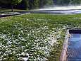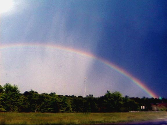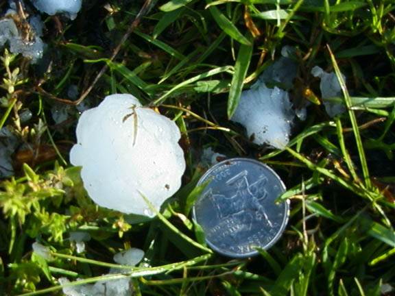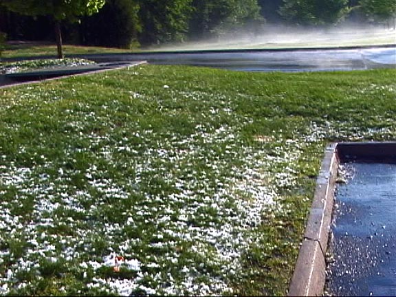 I decided to do a short "gentleman's chase" and investigated a severe storm just north of Richmond, Virginia. I was going to a charity event, but I made a brief detour. Individual storms were forming in north-south line across Virginia and states to the north. One already severe-warned storm was moving across Hanover County. I drove north on I-95, then briefly east on I-295. Viewing was unusually clear for Virginia and the isolated storms were visible from a distance. "My storm" was to the north and rapidly moving away. I could see a nice hail core and rainbow. I turned onto Route 301 north and stopped in the Atlee area just into Hanover County. Hail fog covered many areas and blew across the road. The ground was covered with hail (maximum size: slightly larger than a quarter). After taking some pictures and dealing with some unexpected car trouble, I continued on to the event. Unfortunately, I didn't have time to look for the reported baseball sized hail further into Hanover, County.