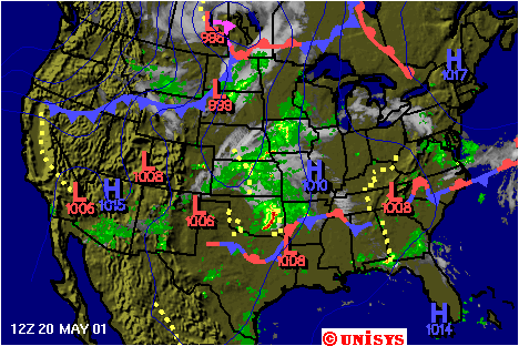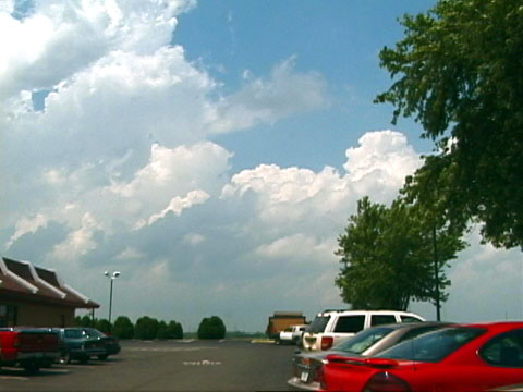 At 3:30, we decided to target the north-east storm. We drove east on Route 19, then north on Route 177. We could see a storm (5V) with an overshooting top, knuckles and we observed the development of a flanking line. We turned east on Route 59 and our caravan got separated. Then it was just Scott Blair and myself. We learned about a tornado warning for the storm at 4:25PM. We could see a huge hail shaft. After Maude and Seminole we picked the northernmost of two close-together tornadic storms. We blasted east from Wewoka on a dirt road (6V) at 5:00PM. Scott was doing an awesome job navigating. The road was a bit scary with deep muddy ruts and dogs chasing us. I lost Scott somewhere near Wetunka. I headed east on Route 9 in blinding rain and wind trying desperately to get ahead of the storm. At 5:46PM, I passed the damage path on Route 9 just east of Dustin. Indian Nation Highway was closed near Dustin due to damage.. The TV station out of Tulsa (audio on FM ?87.7) did a great job with their storm reports. At 6:22PM, I was in Eufaula during the tornado warning. There were reports of visible rotation. All I saw was rain and wind. I was hoping that the curving of Route 9 to the south and across the lake would bring me out of the rain and allow me to view the storm. I passed the DOW at 6:30PM by the lake. I was still in heavy wind and rain. No storm structure or even hail. At 6:45PM while in Enterprise, Oklahoma, I decided I couldn't catch up with the storm and turned south on Route 71 then east on 31.