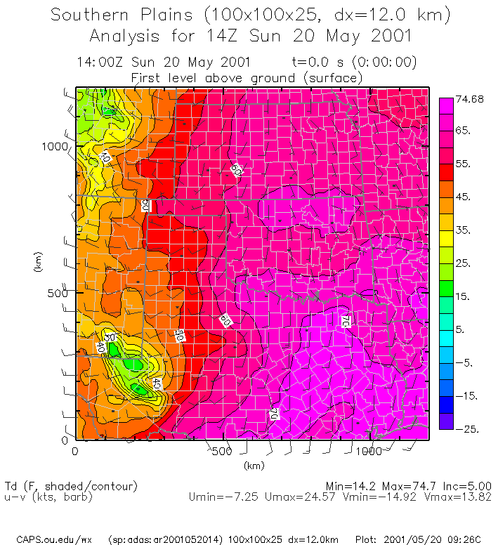 Dewpoint | Wind fields | CAPE (CAPS) | CAPE (ADAS) | 500-hgt |