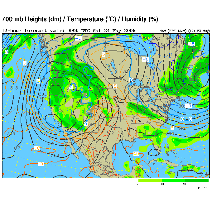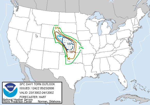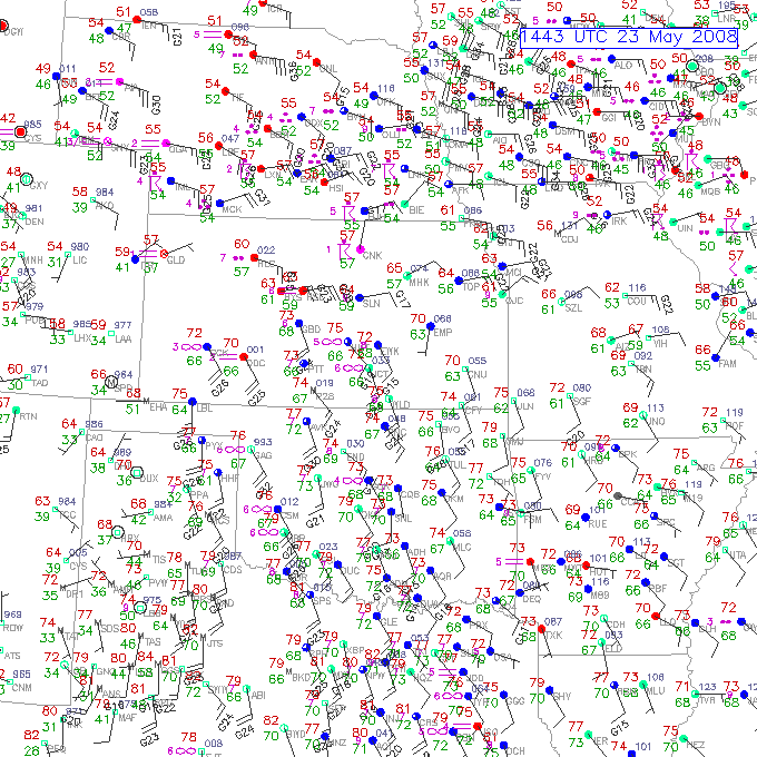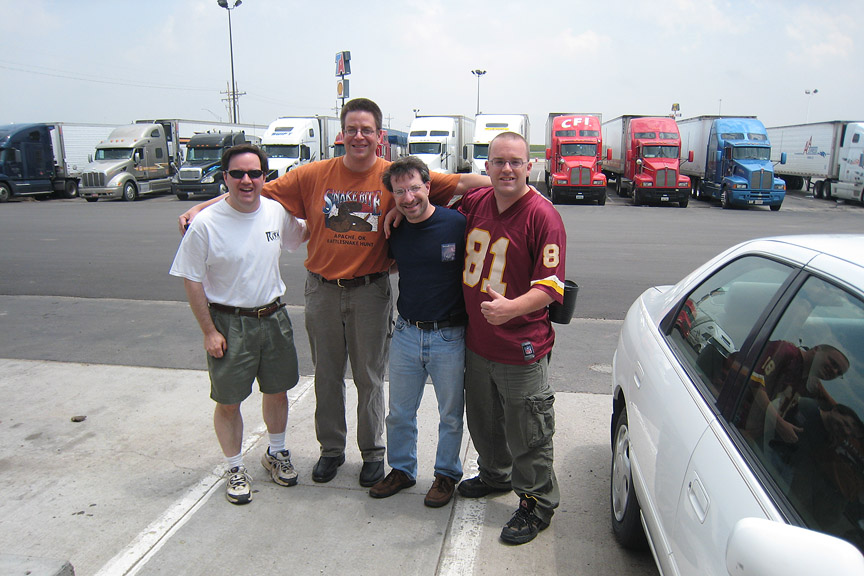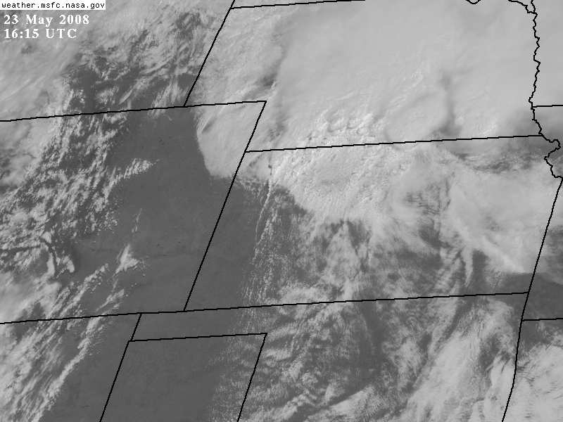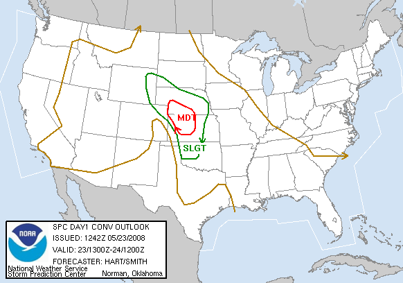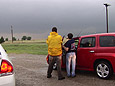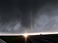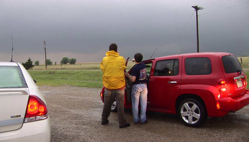 May 23, 2008 was an absolutely incredible chase day with multiple large and violent tornadoes. I started in Hays, Kansas. My initial target was in northwestern Kansas near Colby. Storms were already firing just to the north of the Oakley to Colby area along a boundary that was intersecting the dryline. This boundary paralleled I-70. My secondary target was down south by Dodge City along the dryline where there was better instability but less shear. After missing the previous day's tornadoes, I didn't want to screw up. I headed west on I-70 and met with Jason Persoff and Robert Balogh who were staying in Quinter. We caravanned west to Oakley (home of the world's largest prairie dog) to check more data and make a final decision on the target. There was a massive chaser convergence (image L-R: myself, Robert, Jason and Tony Laubach)(1) at a truck stop. I am sure that makes the locals nervous! We waited and watched while socializing. I enjoyed talking with Tim Samaras, Tony Laubach and Verne Carlson. It was also nice to meet other chasers that I only know through posts on message boards. Elevated storms continued to fire to the north. We expected better storms to fire slightly south along the dryline and move northward. We then noticed a storm developing to the southeast in Lane County. We left Oakley and drove east to intercept the northward moving storm. Additional storms were forming to the south of Lane County. We arrived in Collyer area and waited as the storm approached. The road network was poor. None of us wanted to attempt muddy dirt roads. The storm to our south became tornado-warned. We headed back west to Quinter, then briefly three miles south on Castle Rock Road. As the storm approached the town, we adjusted north and then about a mile west on I-70. My XM satellite radar was slightly off compared to what I could see visually and what Jason saw using GR Level 3. I waited about one mile west of the Quinter exit on I-70. At 4:32PM, a large cone tornado (2) was visible to my south. I got amazing video as it approached I-70. I shifted west about a half mile to allow the tornado to pass. The tornado lifted as the meso crossed the interstate (3). To the north, I could see rapidly rotating rain curtains and a brief spinup. At 4:36PM, there was a brief trunk (4) that was difficult to film due to rain and lightning danger. There was a report of a wedge to the north that I didn't see. I may have been filming under it. The storm moved northward and visibility ended. We resisted the temptation to chase the storm northward over wet dirt roads or to head east to a paved road and backtrack toward the storm. It was very hard to let a known tornadic storm pass northward and not go after it. Thanks to Jason for encouraging me to be patient.