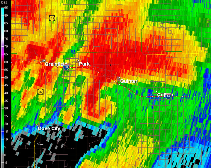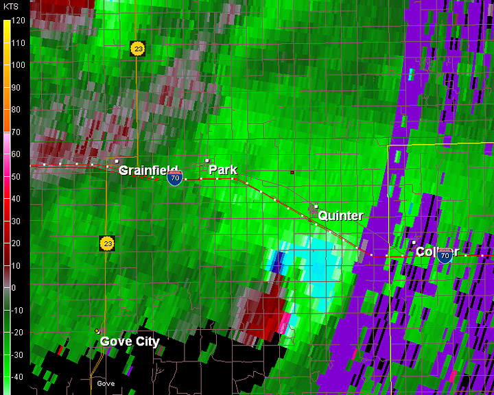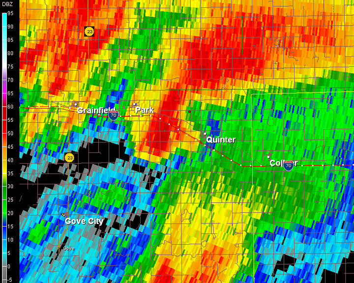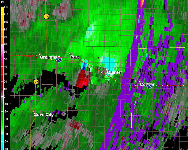 More storms were forming directly to the south. Another possible option was to head south and follow the storm northward. Again, we didn't want to deal with muddy dirt roads. Getting stuck in the wrong place could be fatal with these storms. We did drive south of Quinter for about a mile, stopping at the end of a paved road. Soon, we saw rapid cloud motion (5) swirling to the southwest. Again, my Threatnet XM satellite was off and placed the meso directly overhead rather than slightly west. I knew better due to visual observations and GR Level 3 that Jason was running. I drove up a low hill and could see a distant tornado from a farmer's driveway. The cloud motion was incredible. At 6:12PM, there was a brief satellite tornado (6)(enhanced close-up (7).) The tornado, now a massive high-contrast wedge, approached my location and passed to the west. At times, I could see multiple vortices. (several images are below (8-18) The tornado was approaching I-70. I carefully made my way down gravel driveway, then north toward the interstate. The tornado, now becoming more of an “elephant-trunk”, was approaching the highway. I blasted west, stopping just before the tornado crossed the road at 6:30PM. Jason and Robert had stopped slightly east of my location. The tornado crossed the highway and briefly vanished. I headed west and could see a low-contrast tube to the north. Then a received a report from Robert that a car had been blown off the road. Both Robert Balogh and Jason Persoff, who are also physicians, stopped to render aid before EMS arrived. I called off the chase and circled around to see if they needed any help. By then, EMS had arrived. The car had been thrown way over into a ditch (19). The lone occupant had serious injuries and had to be extricated by EMS. I never saw the car as I passed the damage path. Jason said there were skid marks perpendicular to the road. Another storm was approaching from the south as the storms “trained.” This smaller storm also had a mesocyclone. I warned one of the fire officials. Jason, Robert and I headed back east and then watched a wall cloud (20) from another smaller storm pass near the interstate. I never saw a tornado. Another massive storm, much wider than the previous storms, was now approaching the area. This storm had an enormous hook echo and there were reports of a large tornado. We quickly drove east toward Hays to avoid the core. Tornado sirens were sounding in Hays as darkness arrived. We had our escape route ready. We first thought the town would take a direct hit. The meso shifted, and we took a slight jog west. We never saw anything due to rain and darkness. We didn't want to risk going farther west. Charles Edwards with Cloud 9 Tours was approaching from the west on I-70. He had a better view and saw a large tornado blow a truck off the road. He gave me some radar updates, and we definitely didn't want to go farther west. As it was dark, Jason, Robert and I ended the chase and drove to Russell, Kansas for the night. Robert was able to secure some of the last rooms at the Super 8.