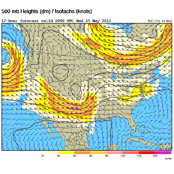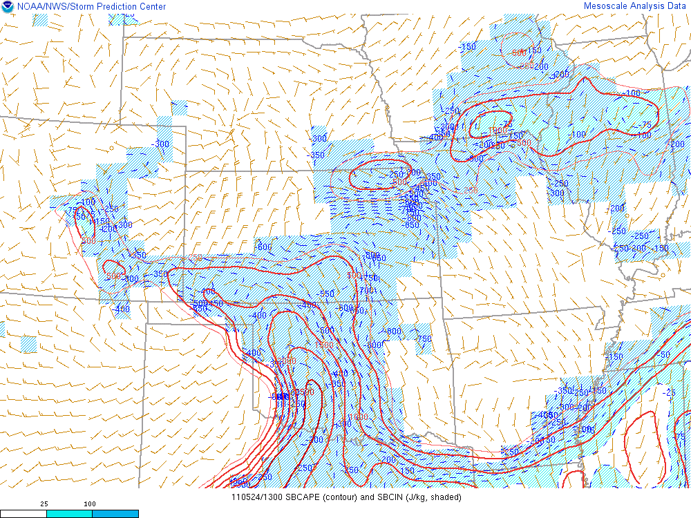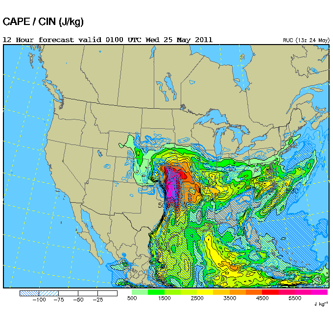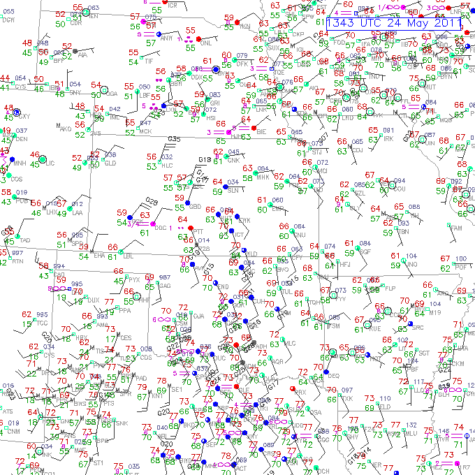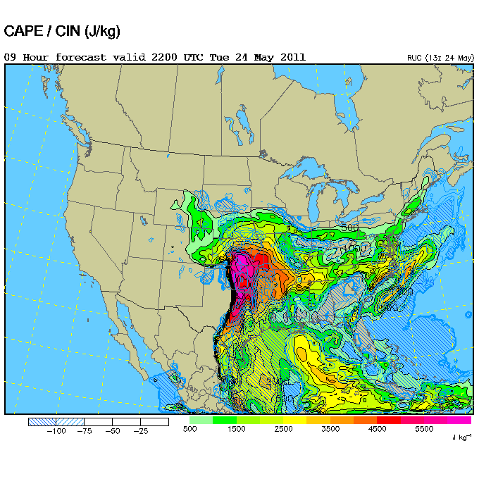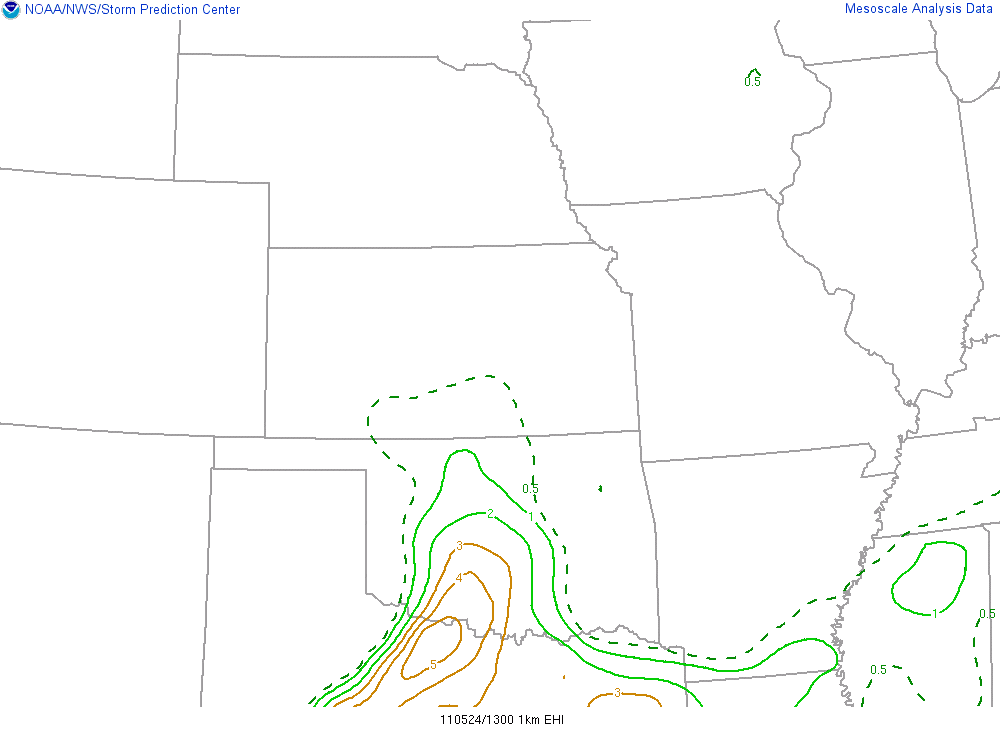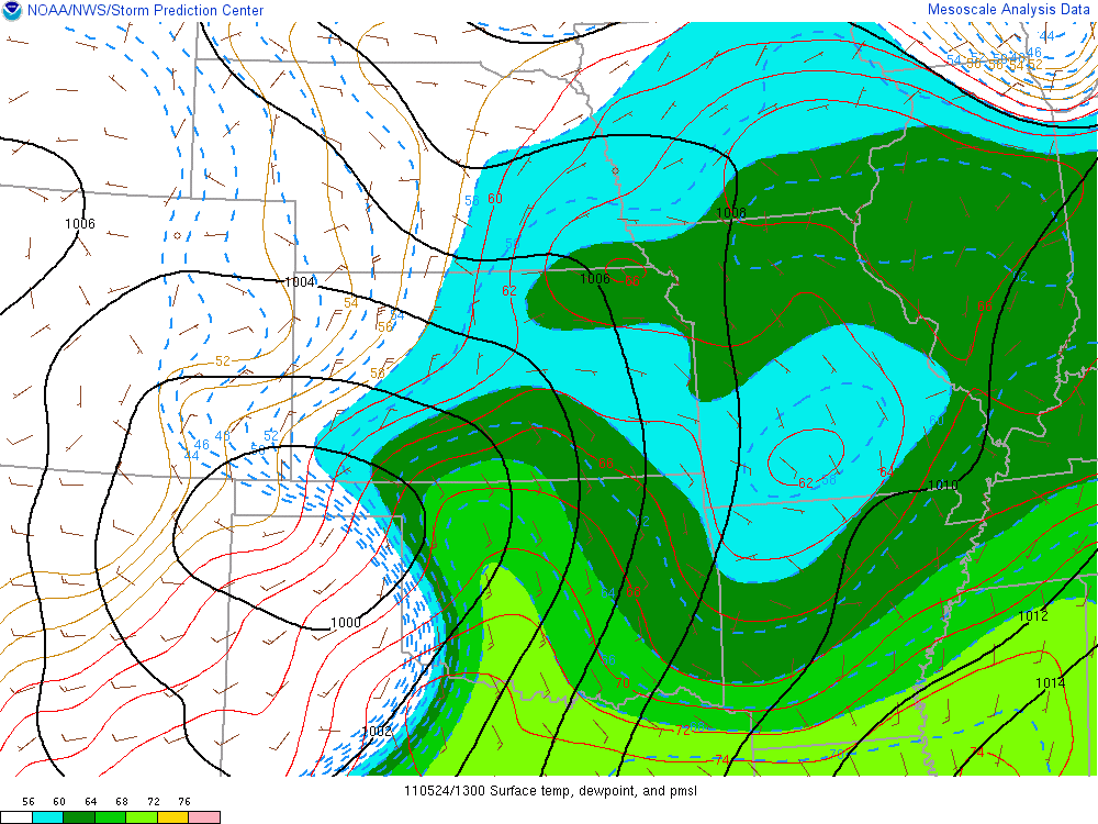 This was an exciting, scary and sobering storm chase. I had one good intercept with a tornado near Shawnee, Oklahoma and encounters with the deadly EF 5 El Reno and Piedmont wedge tornado. A tornado outbreak had been predicted for several days. There was a surface low in northwestern Oklahoma at the base of the panhandle and a negatively tilted trough giving broad southwesterly flow across the region. The low was expected to strengthen and shift northeast. Rich moisture was coming up from the Gulf of Mexico with upper 60's and lower 70's dewpoints across the area. I really liked the southeasterly surface and 850mb flow. Expected CAPE values would be 4000 to 4500. There would be backed winds along the dryline and later storm development along and ahead of that boundary. As expected, the SPC issued a high risk for long track violent tornadoes. Storms would form in Kansas and then there would be storms in Oklahoma.