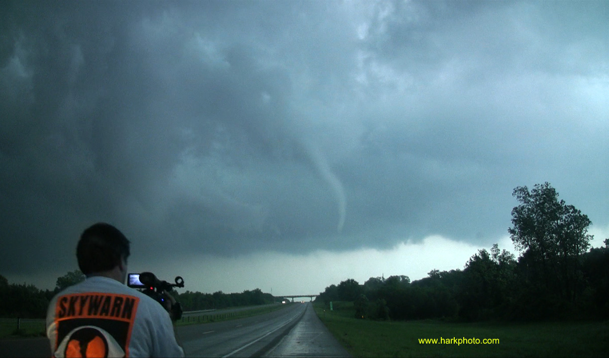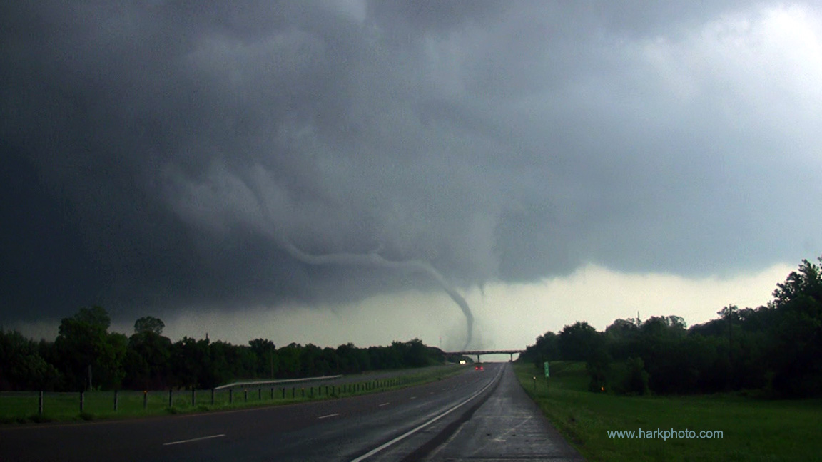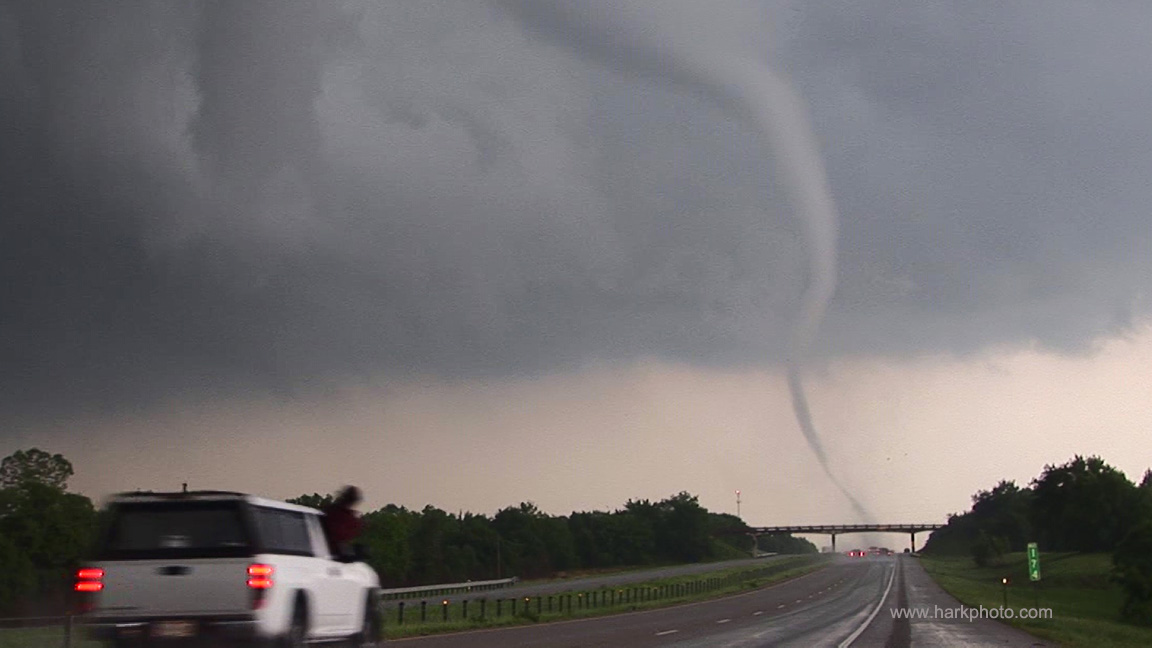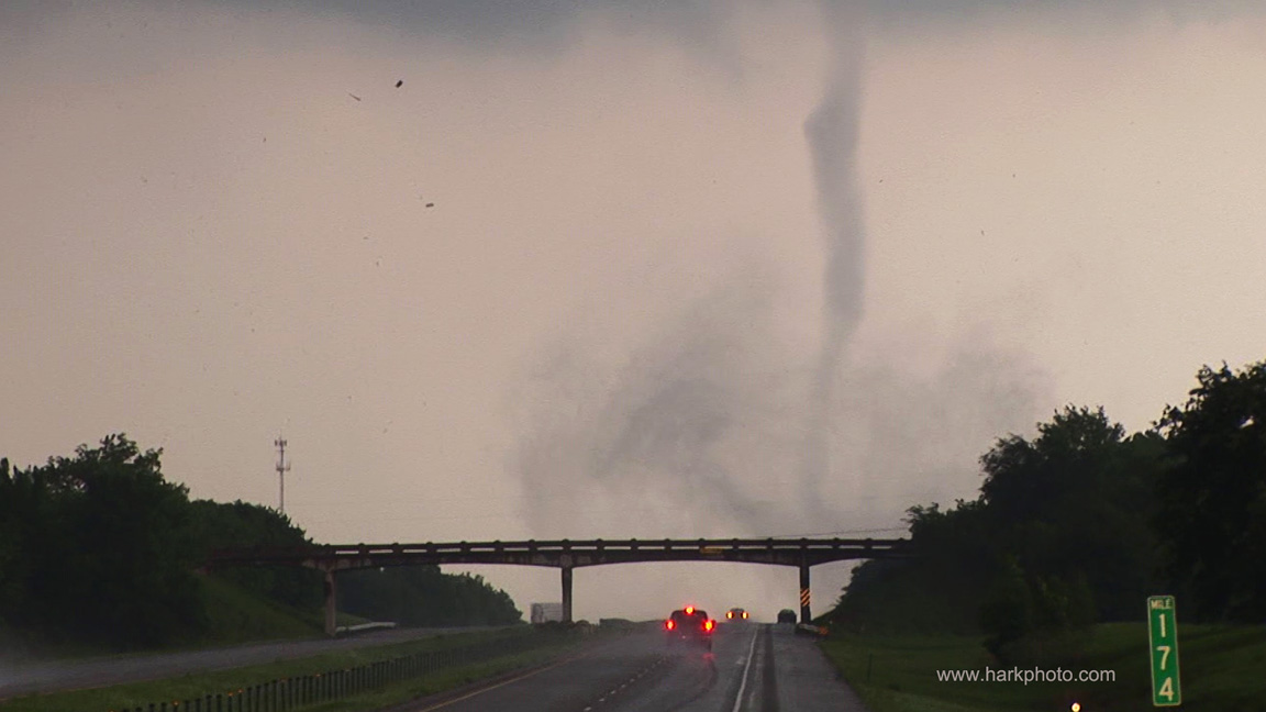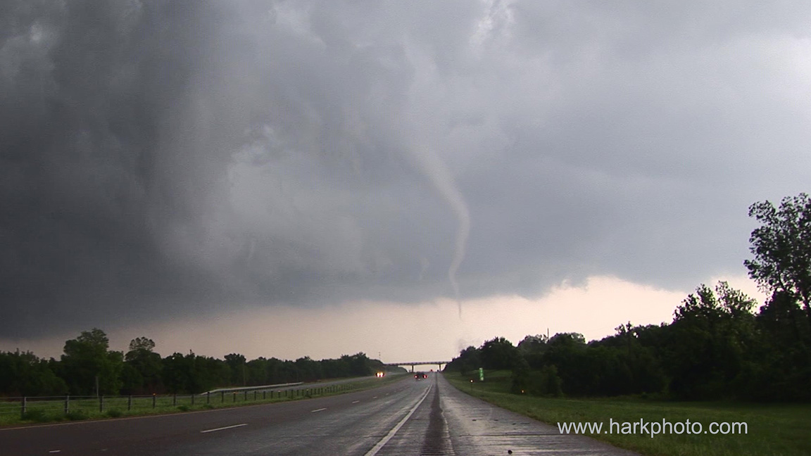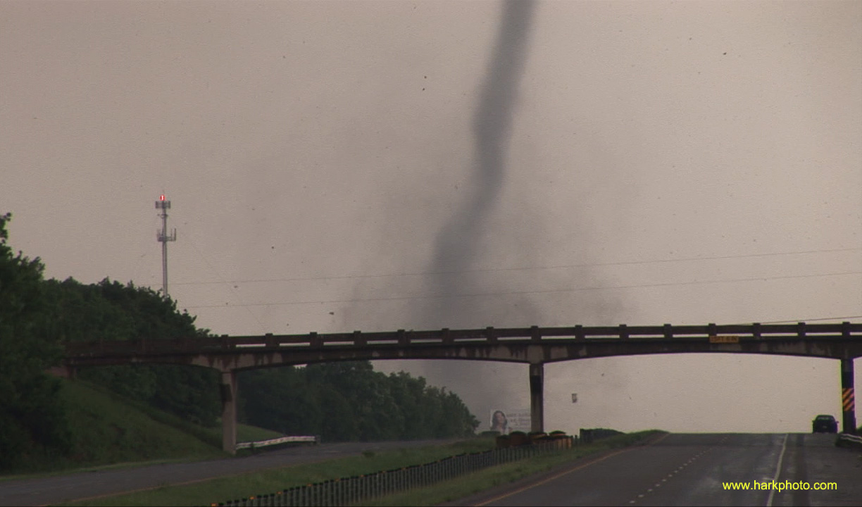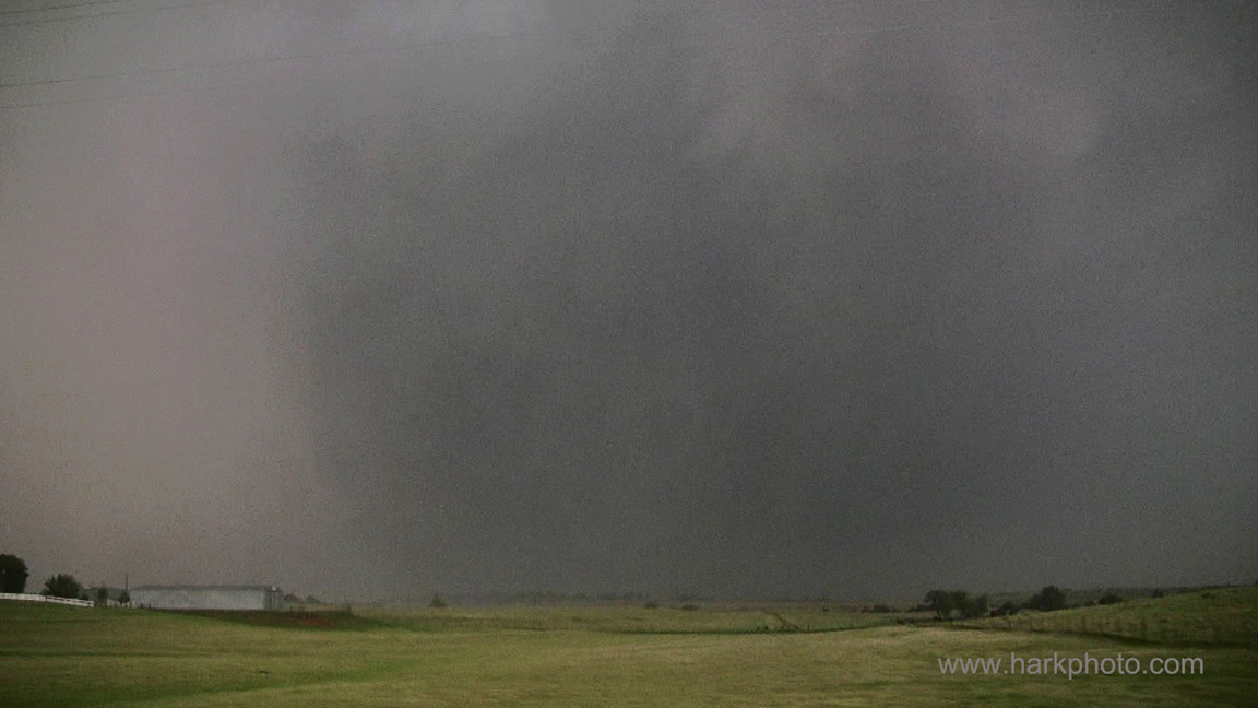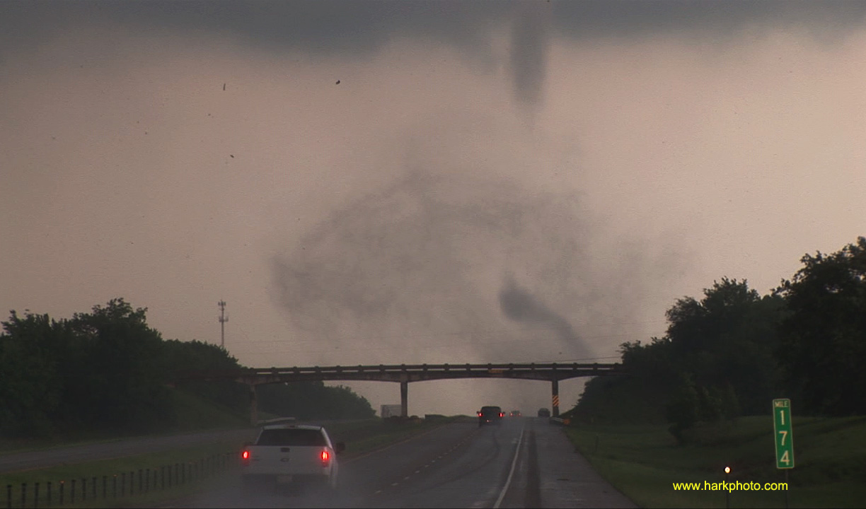 With more tornadic storms approaching from south, I attempted another intercept. I headed east on I-40, then south. There was already a tornado reported near Chickasha. This was rush hour and progress was slow due to rain and traffic. I avoided the limited access highways as my biggest fear was getting trapped in traffic as one these violent tornadoes approached my position. I made it as far as the south side of Norman by 5:48 PM. I was trapped between two tornado-warned storms in very poor visibility. This part of the chase was over. I let the storm to my north pass, and then I headed north and east on I-40. There was a storm approaching from the south, and I had one more chance at an intercept. The presentation on radar was lackluster but I liked the wall cloud to my southeast near Shawnee. I stopped to watch and ran into Chris Collura. Rotation increased and could see an intermittent spinup to the southeast. It increased in size as it shifted northeast. I headed east on I-40 and could see a nice elephant trunk tornado to the east by 6:37 PM. I stopped by mile marker 174 and watched the tornado to my east cross the interstate at 6:38 PM. The bridge in front of me is Ns Co Rd. 330 on the tornado image below. There was a cloud of debris on each side of the interstate as it crossed. I later found out that the second cloud of debris was a truck that was demolished. There was a live view broadcast on television from a nearby helicopter. I approached the tornado and watched it dissipate by 6;39 PM. Visible rotation continued but no more tonadoes. I took exit 186 and headed north on 18 and east on 180/62 tracking the storm. I reached Prague by 7:11PM. At this point, I ended the chase and headed back to Norman. My trip was interrupted by a flat tire that I changed in Shawnee. This was an annoying way to end a wild chase day. I encountered the nasty rain-wrapped El Reno/Piedmont wedge tornado that formed after a handoff from the Lookeba tornado. I was in the middle of that handoff and likely was grazed by the developing circulation of second tornado; one that was later rated as an EF5. I also obtained nice video of the beautiful Shawnee tornado from a safe distance. I was very lucky with my encounter of the developing El Reno tornado and have reassessed my chasing style and the importance of safety. For a high risk day, this was a very difficult chase due to numerous adjacent or “nuisance” storms along with heavy rain wrapping that reduced visibility. This chase was also very sobering due to the terrible devastation caused by the El Reno/Piedmont tornado. Later that evening, I found out that Rocky and his family was safe but many of their neighbors lost their homes.