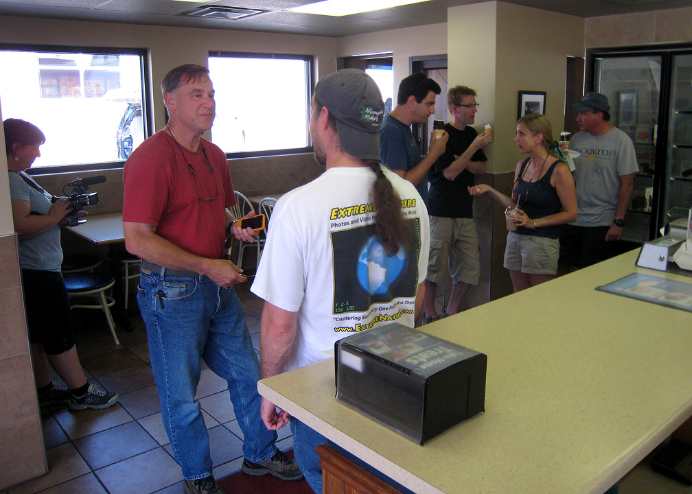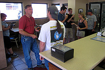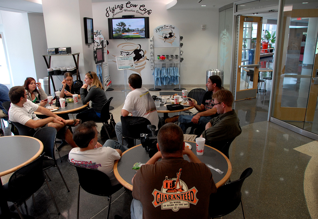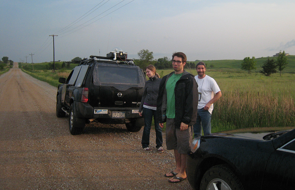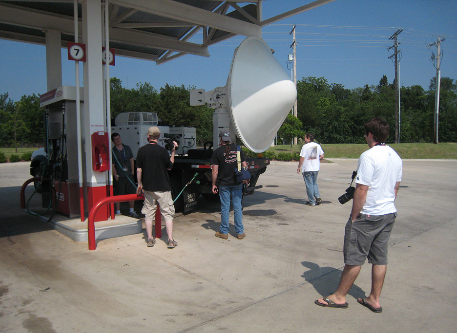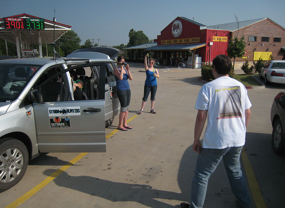 May 27th was a clear sky bust. The target was around Oklahoma City. The parameters appeared great except there was a strong cap or layer of warm air that can suppress development. We started the day in Norman, Oklahoma just south of Oklahoma City. We had time and Jason Persoff was able to arrange through some friends, a last minute VIP tour of the National Weather Center. This new facility houses university and government agencies including the Storm Prediction Center, National Weather Service and the OU meteorology school.This is an amazing facility and is the "center of the universe" for those who research severe weather and climatology. In the lobby, there is a massive globe with a real-time projection of the earth from satellites. After the tour, we ate lunch at the Flying Cow Cafe. We then monitored weather data from the lobby of the National Weather Center. This was a more pleasant place to wait for storm initiation than a gas station parking lot. By mid afternoon, we moved our waiting area to a local barbecue and OU sports restaurant (Rudys). Several of the lead forecasters dropped by while we were there, and we chatted about the recent tornado outbreaks. We joked around in the parking lot and checked out one of OU's Rapid X-Pol mobile radar units. By evening, it was clear that the cap was holding firm and we all left for Woodward, Oklahoma for the evening.