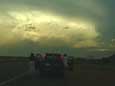 There were reports of towers forming to the west and Chris, Dave and myself headed toward Jayton and Spur via state roads 380 and 70. By 5PM, a storm was visible to the northwest. We intercepted the forming low-precipitation supercell (LP) just south of Matador. The storm (2P) was high-based but we hoped it would move into an area of better moisture and strengthen. We found a picturesque place near a farmhouse to watch the storm. Cloud 9 (3V) and some other chasers joined us. We watched the storm wax and wane in intensity but it just didn't organize enough to form a tornado. The storm was moving slowly and I (4V) was able to leisurely photograph it. Other storms were forming in the area including a distant and possibly tornadic one (5V) near Lubbock. Our group left, forming a long chaser caravan heading south on 70. There were chasers parked along the road, and I am still amazed at the number of people standing outside in very lightning-prone areas (6V) of the storms. By 7PM, Chris, Dave and I were back in Spur and then headed west on state road 261. It seemed like rush-hour with the the number of chasers that were crowded along the narrow road. The Doppler on Wheels research vehicle from UMass was also in the group of chasers. We watched numerous cloud to ground (CG's) lightning strikes (pic #1 (7V) and pic#2 (8V)) from the nearby storms. We drove through one storm with pea sized hail and came out of the rainy dark core to view the gorgeous sunlit side of the storm with a white hail core and rainbow (9P). As the the sun set, we watched the changing colors of the clouds and nearby storms (pic of Dave and Chris;10V) . The dying storms produced mammatus clouds (pic #1 (11V) and pic#2 (12P)) which glowed orange and red as they faded. We then had a long and tiring drive to Amarillo.