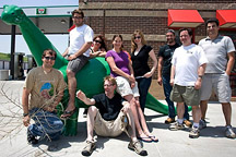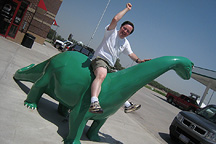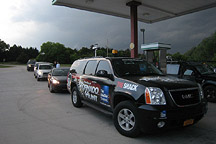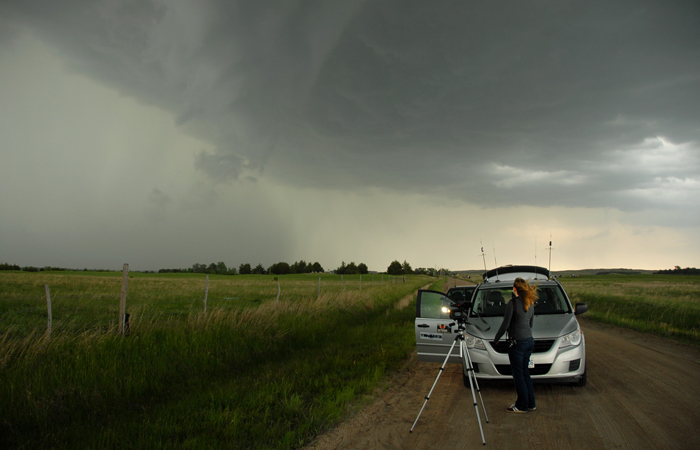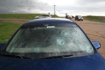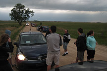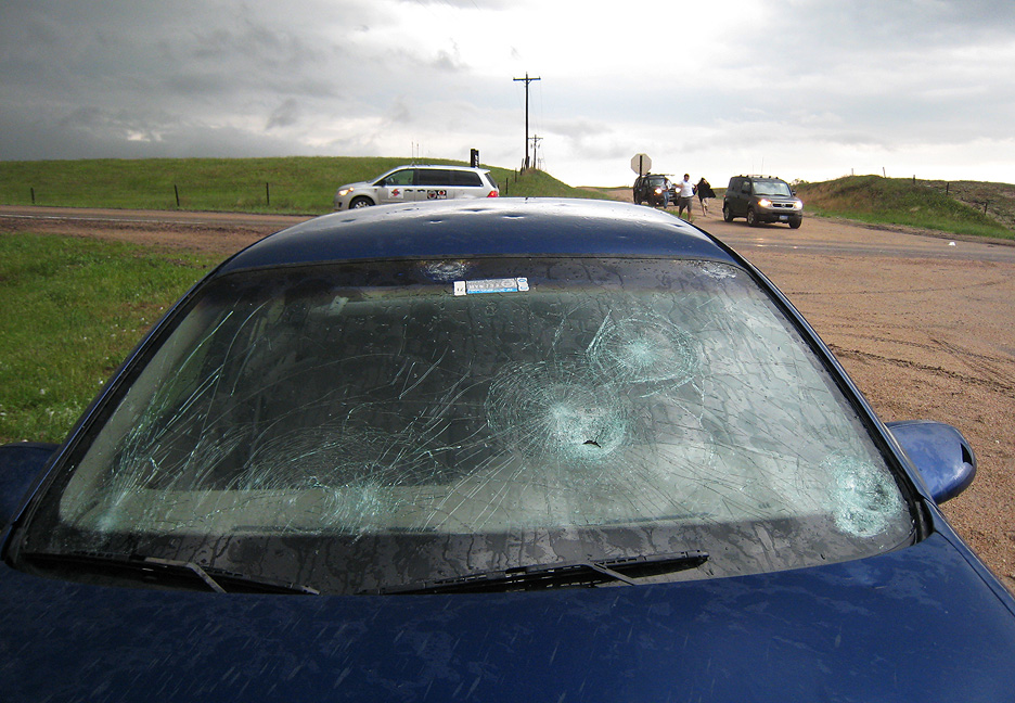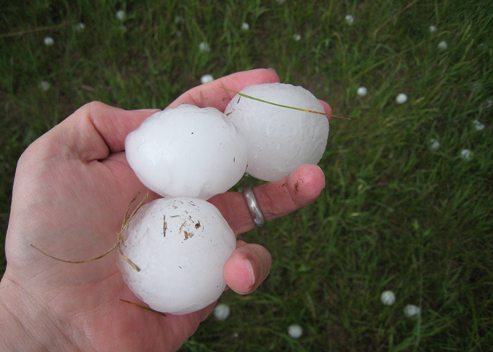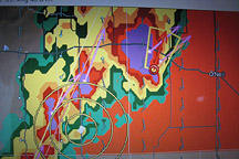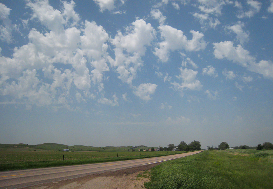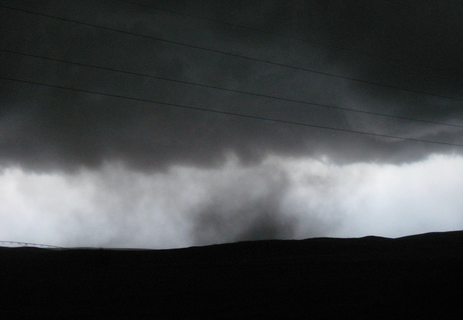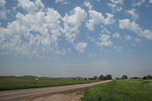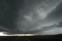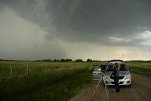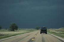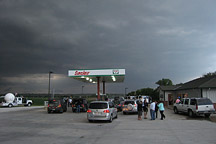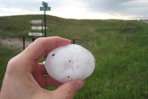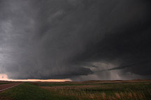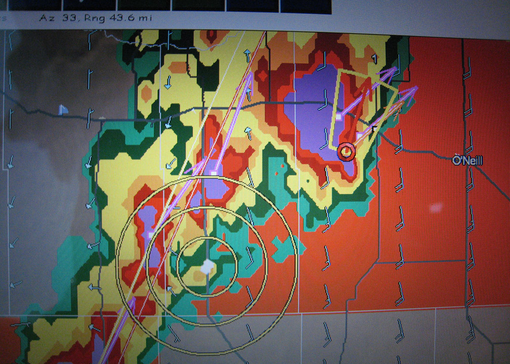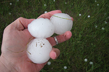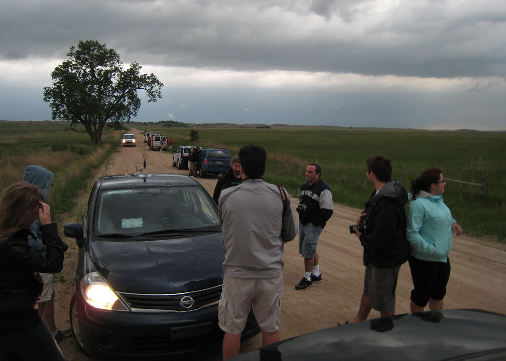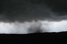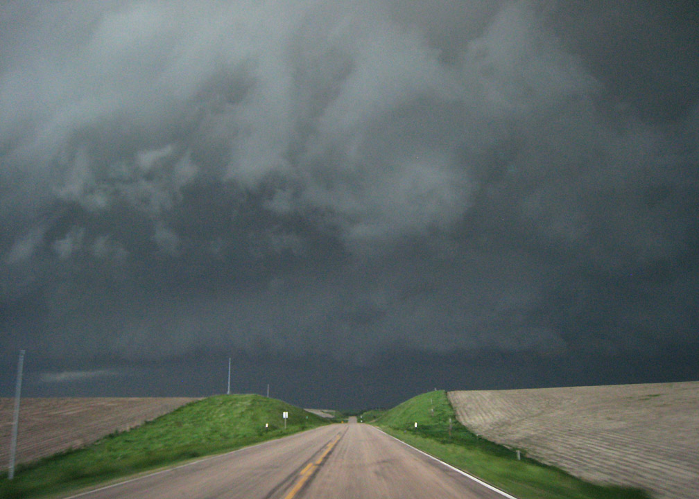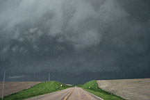A tornado watch was issued for our area. Soon, a diagonal line of cumulus was visible just to our west. When a couple areas of cumulus appeared "agitated", we quickly drove northwest to Burwell and continued west. We could see storms exploding to our southwest. These would move rapidly to the north, and we wanted to be on them early. Near the town of Brewster, we could see the dominant storm rapidly growing. Unfortunately, the storms were also becoming a north-south line. We watched our targeted storm as it approached us and passed us to the north. There were now additional storms to our south to watch pass by to our west as they moved north. The road network was terrible, and there was no way we could follow the storms northward and have escape routes. Just to our north, our initial storm developed signs of rotation. The storm became tornado-warned farther to the north as it crossed 183 and as it headed toward Atkinson. It was moving northeast at 50 miles per hour. Although we couldn't catch our initial storm, we hoped that other storms in the line would take the same amount of time to intensify. We headed southeast, then north on 183. Our northward progress was blocked by additional storms. Where our initial storm had crossed 183, there were hail stones that still measured 2 ½ inches in diameter after melting for over 30 minutes. Several chasers had their windshields damaged. We played with the hail and waited for additional storms to pass by to our west. We couldn't go farther north or east due to the poor road network. Several of the storms to our west showed signs of rotation but we couldn't get safely close enough to investigate. We dropped a bit south as the northeast to southwest line of storms slowly shifted toward us. The motion in the clouds was intense and we saw several brief funnels in the swirling clouds. Meanwhile, on radar, we could see that our initial target storm was southwest of Atkinson, Nebraska and had a nasty hook echo, indicative of a tornado. Any chaser approaching from the east would have a nice safe view of the storm crossing the road. With the northern route completely blocked and no east options, we headed south and stopped for fuel at a gas station in Taylor. It was packed with chasers including Silver Lining Tours, and The Weather Channel's "Great Tornado Hunt" entourage. After a bit of a wait for gas and bathrooms, we decided to go our separate ways. The Canadians had to start driving back to Ontario and Chris was going to drive back to Florida. I also had to get back to Wichita that night. Only Dave and Scott had more days of chasing.