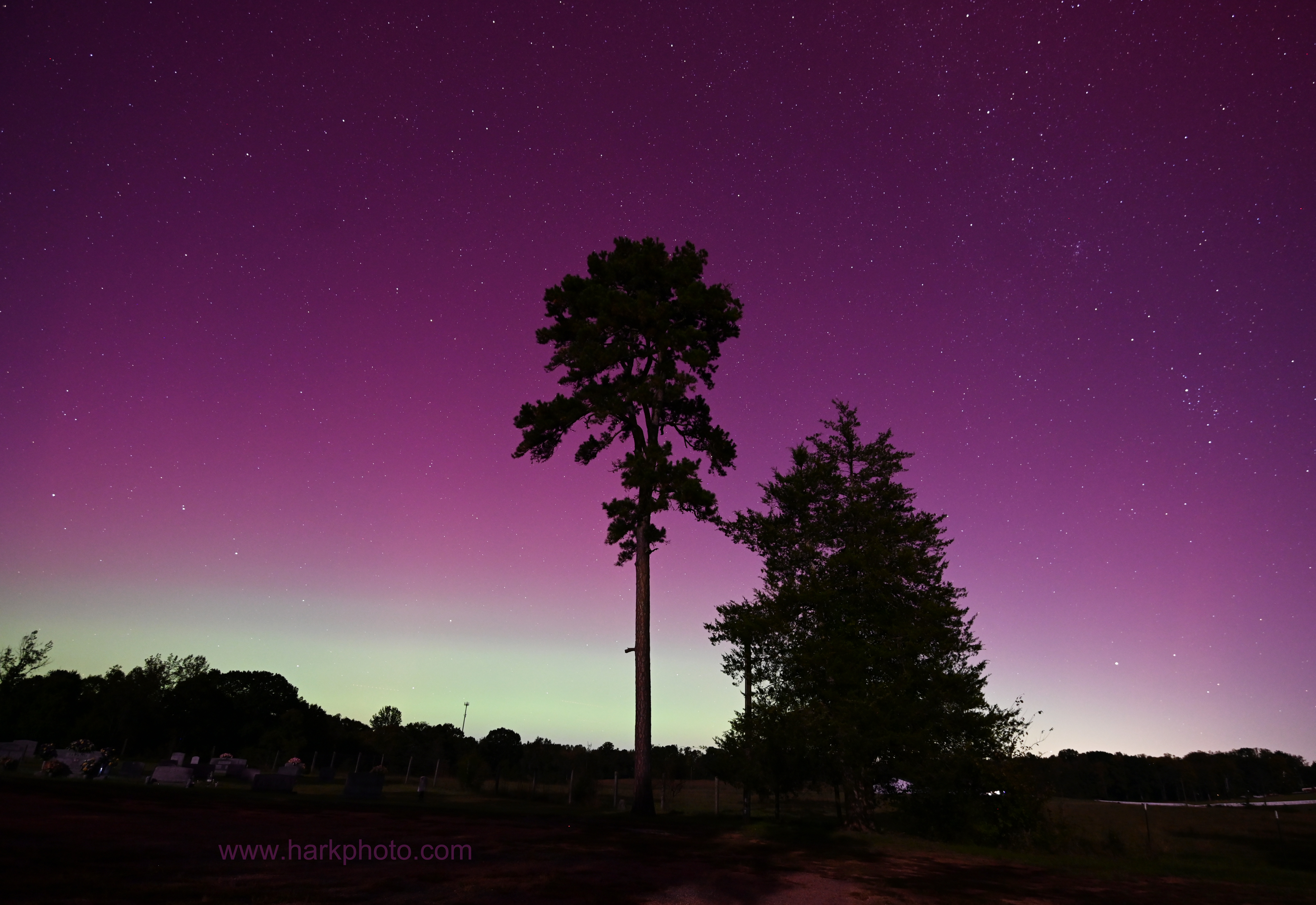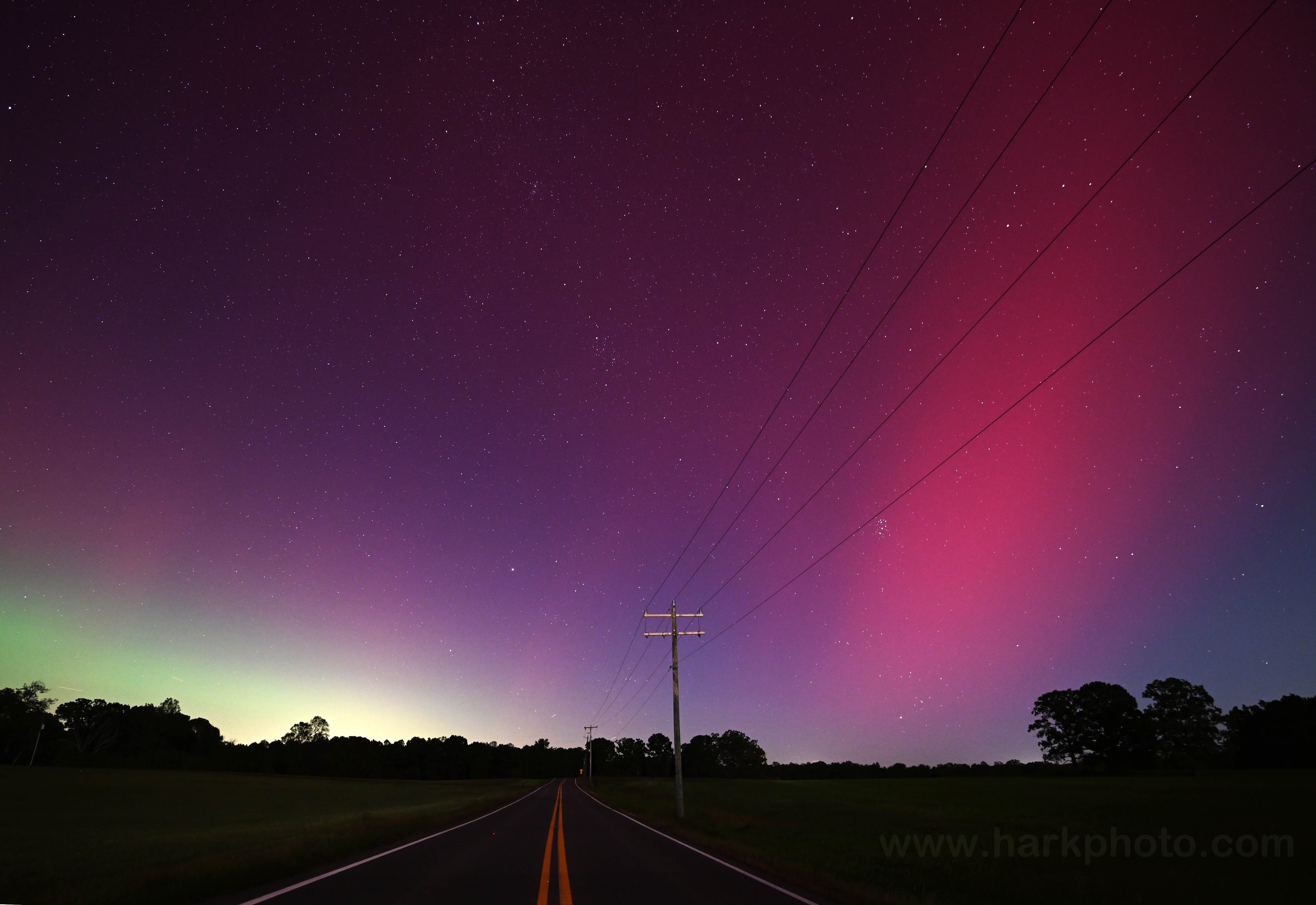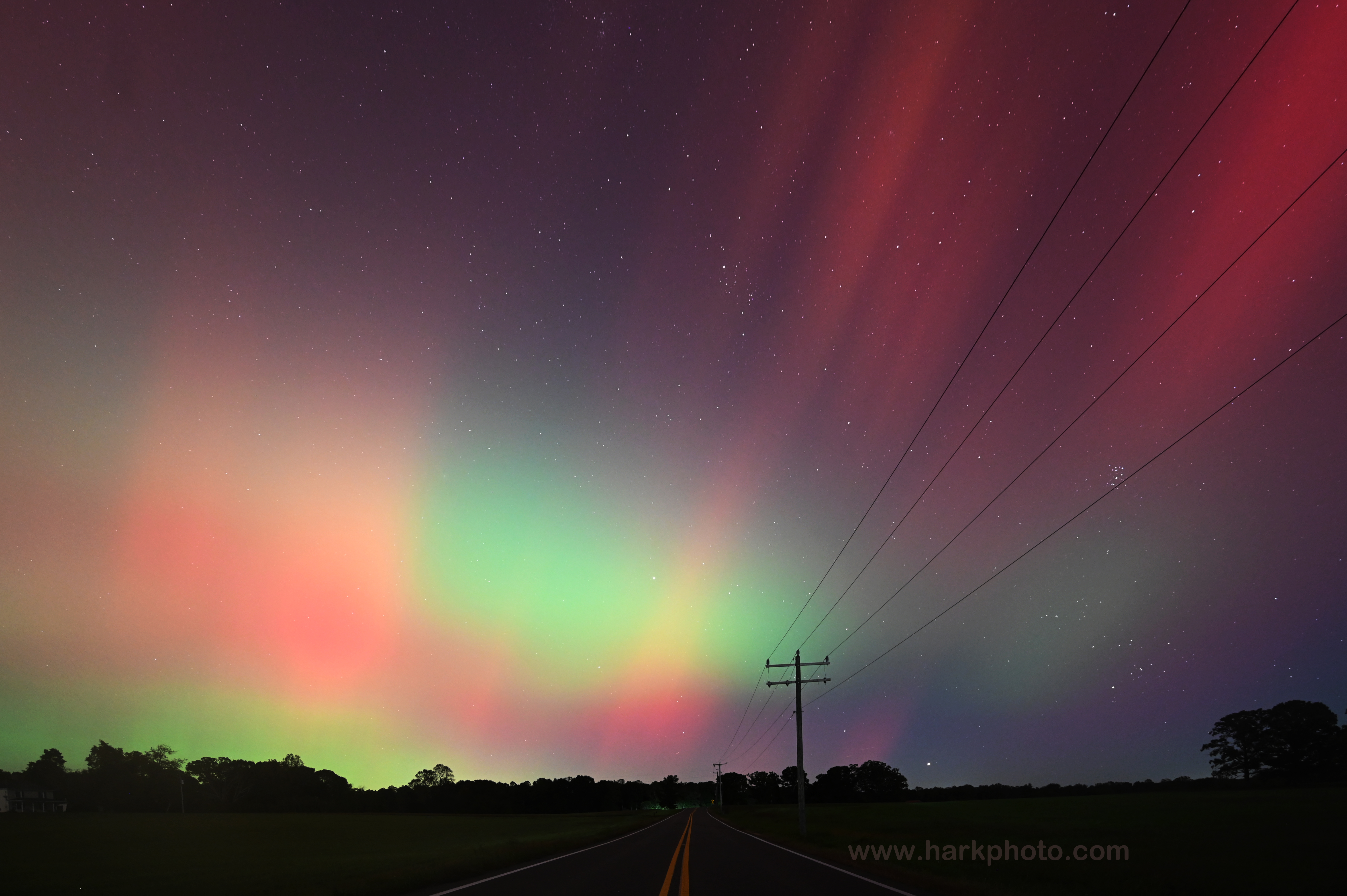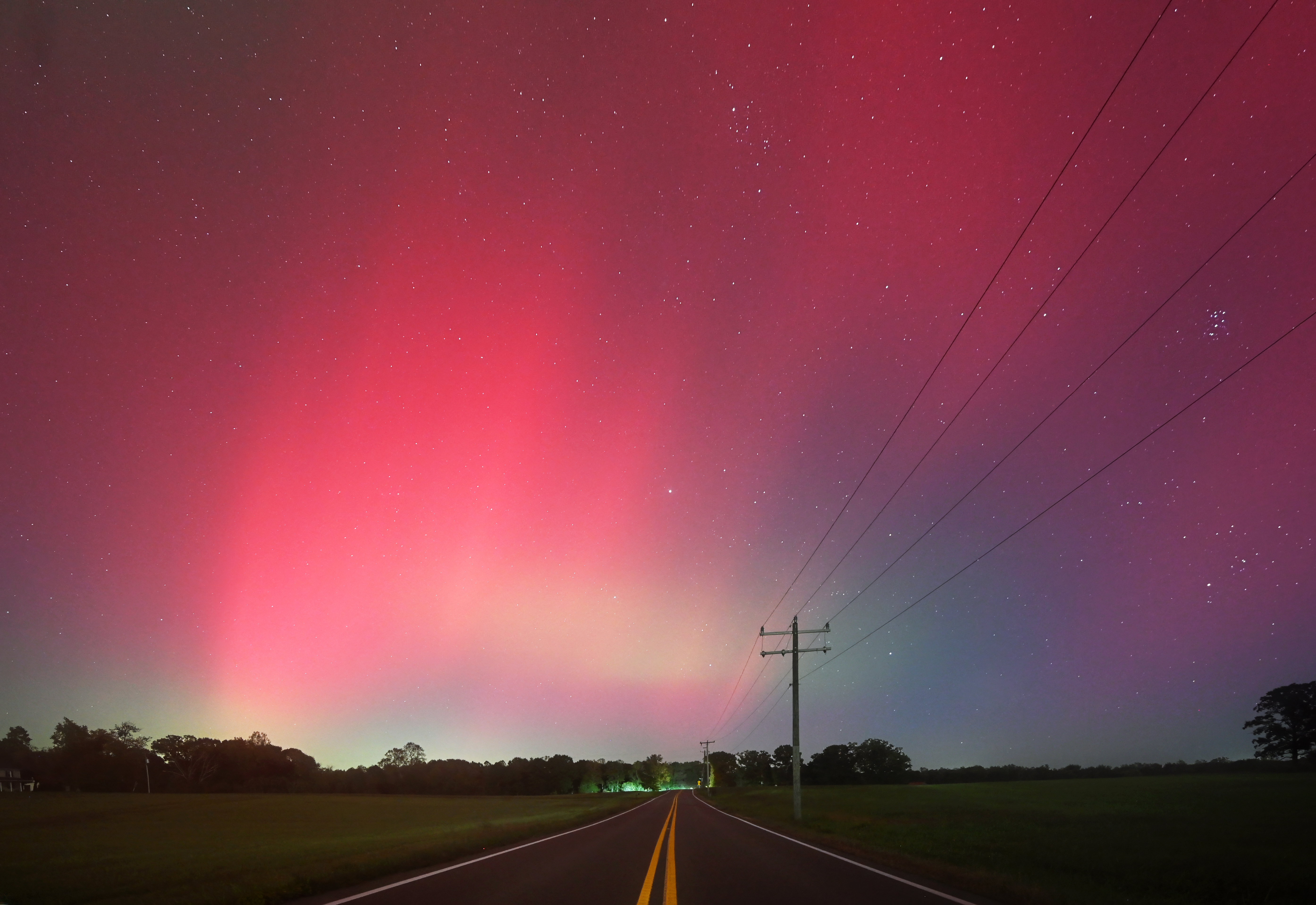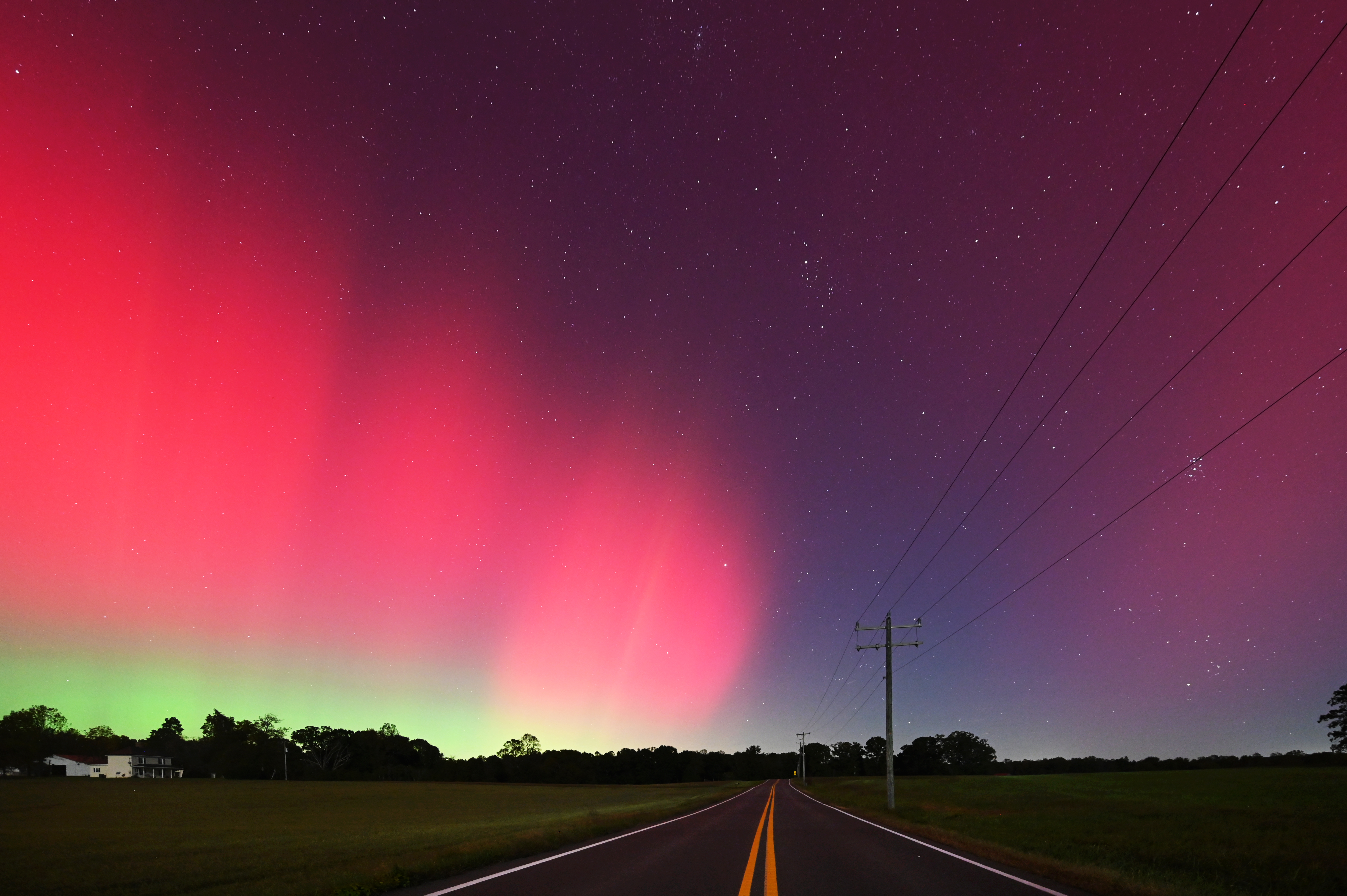Ginny and I had an aurora chase date! Last night was absolutely incredible. At times, we could easily see the aurora with our eyes as it rapidly pulsated and shifted across the sky. Not just red, but green, white, pink and purple. With aurora expected, Ginny and I had a quick barbecue dinner while listening to some bluegrass music outside, and then headed west at dusk. I was worried that any activity would be waning as the CME hit the earth much earlier in the day. We arrived at our first viewing location in Louisa County at 7:44 PM. The sky was glowing to the north with a dull reddish color visible to our eyes. There was also a band of whitish to slightly greenish glow both above and below the red glow. The red glow expanded to almost overhead and also to the east, west and south. At times, faint red columns were visible, but overall not much structure. The aurora areas appeared like swaths of paint. By 8:30 PM, we decided to change to another location because the traffic on the nearby road was getting annoying, and we wanted a different foreground. The aurora display was decreasing. From our new vantage point at 9:00 PM, the aurora appeared as a broad whitish band extending upwards from the horizon similar to distant city lights. Above the whitish band that was increasing in width, the sky was red/pink. Not much internal structure. This was visible to our eyes though not as bright as was appearing on my camera or our phones. To the west, a narrow red isolated column extended upwards from the horizon. As it was getting late, we decided to leave that location to head home. We stopped by our original viewing location at 9:50 PM to adjust some items in the car. I took a quick look, and the aurora seemed to be increasing in intensity. Within a couple of minutes, red columns and spires were rapidly shooting up from the horizon. Another substorm! I scrambled to get the camera set up. The columns rapidly appeared and vanished while shifting. The northern sky was pulsating with blobs of red, white and green. The colors were the most intense naked-eye visible colors that I’ve ever seen with aurora in Virginia. The most intense and structured aurora occurred in a substorm between 9:58 PM and 10:30 PM. The display gradually decreased, and we left by 10:45 PM. There were more substorms later that night and aurora was photographed as far south as Mexico and Cuba. What an amazing evening of aurora viewing! I am still surprised at the intensity of the visible colors during that last substorm. It was a wonderful aurora date night!