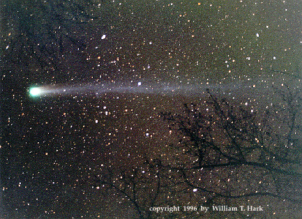 Comet Hyakutake photo taken in Goochland Co., Virginia on March 25, 1996 by William T. Hark. Equipment: Nikon FG with a 50 mm lens. Kodak Gold 1000 film. Exposure between 20 and 25 sec. It was scanned using an HP ScanJet II/cxt scanner and Adobe Photoshop. The file is in jpeg format and is best seen with a monitor configured for "millions of colors" rather than 256. There should be trees visible in the foreground.