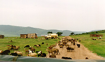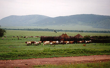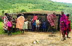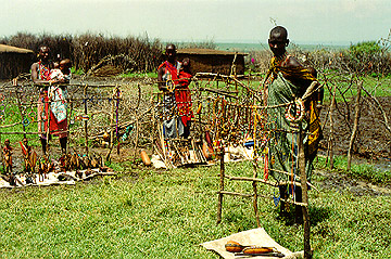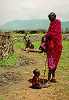 The Masai are members of the Nilotic tribal group along with the Samburu. The Masai are a well known colorful people who are mainly cattle and goat herders. They like to adorn themselves with colorful cloth and beads. Wealth is measured in cattle. The traditional villages surround a central area. The young males go through a period of warriorhood before they marry. Men generally make the tribal decisions and care for the cattle. The women build the houses and talke care of the home. More and more villages are becoming less traditional. This can be seen by flat metal roofs instead of thatching, all wooden houses and even farm plots. Growing food is frowned upon by traditional Masai. There are even some homes with satellite dishes. In villages near lodges, income is supplemented by posing for photos, selling used spears or performing tradtional dances.