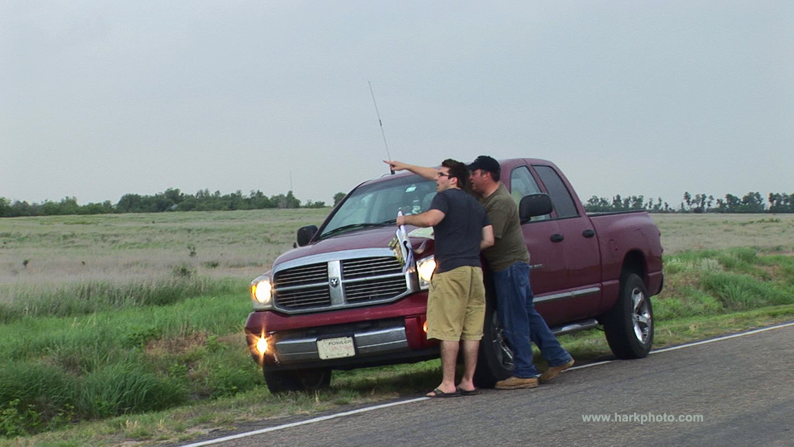 I had a nice lunch at the Serva-Teria in Pratt while checking more data. They have a nice lunch buffet with a “down-home” atmosphere. I could also sit by the window and keep an eye on my chase vehicle and also use the Cradlepoint wi-fi from that vehicle. Robert Balogh met me at the Serva-Teria, and we looked over more data. Our area was looking more promising. We left the restaurant and decided to wait at a nearby Walmart parking lot with a nice view of the sky. There was a large chaser convergence including Charles Edwards, Mike Theiss and his wife Andrea and George Kourounis who are all with Cloud 9 Tours. We also saw Tim Marshall and the assorted Doppler on Wheels/University groups along with Sean Casey and his TIV (Tornado Intercept Vehicle). The storms had initiated in a linear mode by 3 PM along the cold front. The appearance was very unimpressive. Robert Balogh and I, in separate vehicles, headed north on 281 toward the linear storms. The storms were high-based. By 3:44 PM, we saw our first landspout in Stafford County. After the initial landspout, we followed the storms and met up with Canadian chasers, Dayna Vettese , Brad Rousseau and Simon Eng at 4:18 PM, and we watched some rotation in the clouds. With large hail approaching, we turned east on 50 and south on S. Langdon road along the line of storms. They were still high-based. We became separated from the Canadians, and we shifted east and then further south on 14. At 5:34PM, we could see a distant landspout under high-based storms. We passed through Kingman, Kansas at 5:42 PM and could see a funnel to the west. Two miles south of Kingman, we stopped on 14. The funnel was still present, now to our northwest at 5:46 PM. To our southwest, we could see a nice landspout that was initially visible at 5:44. It lasted until 5:45, and the funnel reformed at 5:46 PM. The funnel to the west of Kingman and the landspout to the southwest were visible at the same time. The high-based storm was slowly shifting toward us. By 5:47 PM, the funnel to the northwest (west of Kingman) had lengthened and narrowed to a nice rope tornado that briefly touched-down. It did not have the typical landspout appearance of the other tornadoes. With increasing hail and rain, Robert and I left the area and headed farther south. Additional landspouts were developing to our west. At 5:57 PM, 3.8 miles north of Rago, we saw a nice landspout to the west and another was visible further south along the line of storms. We watched the two tornadoes for about 5 minutes and then continued south passing through Rago at 6:09 PM. At the intersection of NW 150 and 14 in Harper County just south of Duquoin, we stopped and met up with Canadian meteorologist Brad Rousseau who had just proposed to meteorologist Dayna Vettese in front of another landspout to the southwest. We took a few pictures at 6:17 PM and blasted west on 150 to get a better view of the landspout. This landspout initially appeared weak and similar to the previous landspouts. With a nice road west, there was the opportunity to obtain closer images. The dusty slow-moving tornado was initially just south of 150. We parked at approximately 6:22 PM and watched the storm cross the road. The tornado was moving into a large wind farm. We shifted slightly east at 6:24 PM after a police officer yelled at us to “move!” The tornado was to the northeast. Our second viewing point was at the intersection of NW 150 RD and NW 40 Ave at 6:26 PM. (150 is an east-west road and 40 is a north-south road). We watched the tornado shred a wind turbine and pass between other turbines and oil wells. I was able to obtain nice zoomed close-up video segments of multiple vortices. At 6:31 PM, the tornado was to our north. NW 40 Ave was a direct route north to the tornado, but the road was very muddy and slick, and we elected not to chance an intercept. A solid wall of rain and hail prevented further progress to the east and that rain and hail was increasing in our area. Robert and I shifted slightly west on NW 150 to get out of the rain. There was another weak-appearing tornado to our southwest at 6:34 PM. We could see the main tornado to the northeast and by 6:42 PM, the tornado was white and nicely placed with a wind turbine in the foreground. The tornado faded into the rain as it dissipated. This tornado was the one that crossed 14 and was filmed at close range by Cloud 9 Tours. We had to wait for the rain and hail to shift farther east before we could leave the area. The evening ended back in Wichita with a traditional post-tornado intercept steak dinner at Hangar One Steakhouse. Robert Balogh, Dayna Vettese, Brad Rousseau, Simon Eng, John Mann, and I enjoyed a nice chaser dinner to celebrate our intercepts. Jason Persoff, who had given John Mann a ride from Denver to join up with Robert, missed dinner as he needed sleep. Jason was on the northern side of the storms and also saw some nice tornadoes.